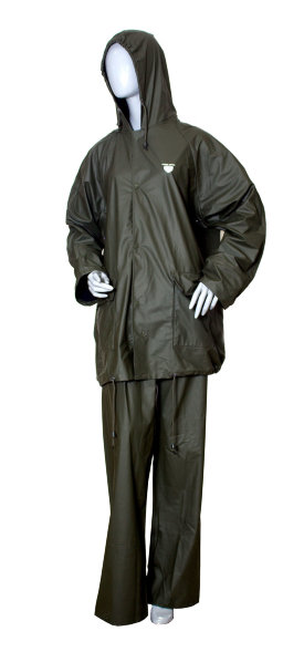 Костюм влагозащитный выполнени из ПВХ с подкладкой из нейлона. Состоим из куртки с капюшоном и брюк. Куртка снабжена центральной застежкой на молнии. Молнию защищает клапан на кнопках.