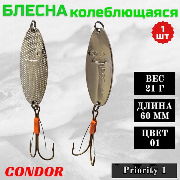 ➤ Какие характеристики у товара "Блесна колеблющаяся незацепляйка Condor Priority 1 размер 60 мм вес 21 гр цвет 01 1 шт"?